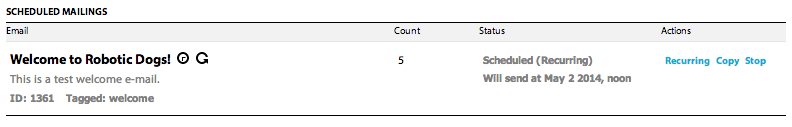 You can’t edit a live recurring mailing. To get a draft you can edit, you must select one of these two options. If you click copy, your current welcome email will continue to go out while you make your edits. If you click stop, nothing will go out until you’ve made your changes. Let’s use copy for this example.